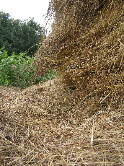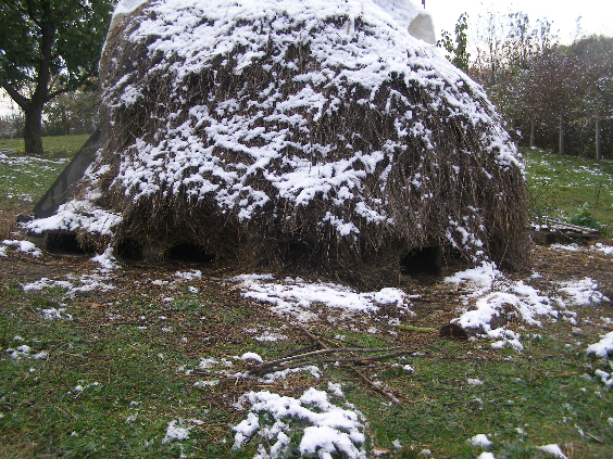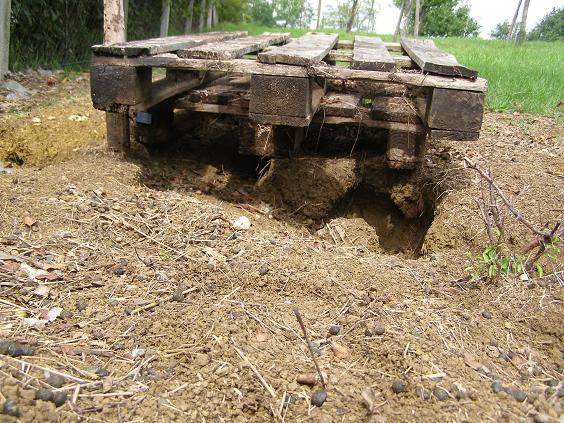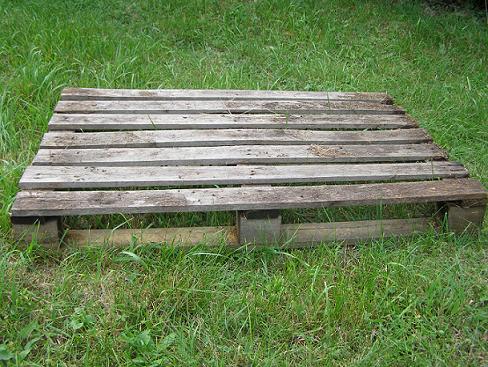Ako nije ravan teren palete se podboče sa ciglama ili drugim blokovima da bude na horizontalnoj ravnini. U sredinu vertikalno zabijete običan kolac ili štap (na suhim tlima potrebno je vlažiti rupu vodom i tako je "izgraditi" ) te složite sjeno oko njega.