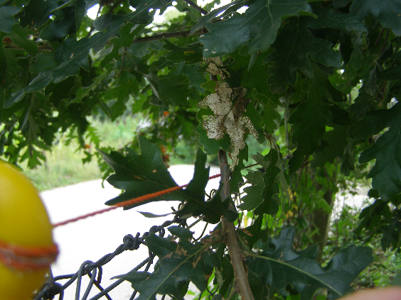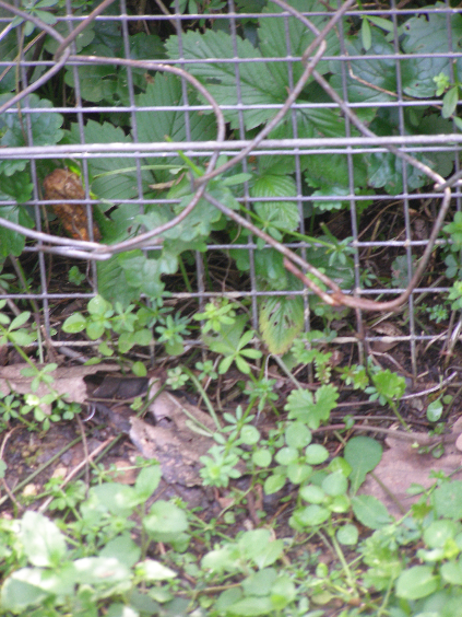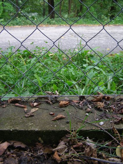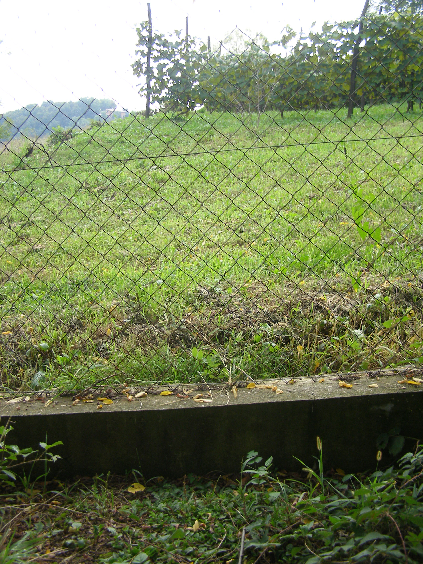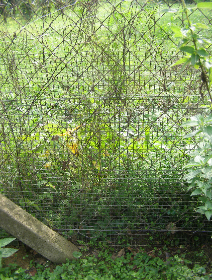 (sitna žica,a na slijedećoj slici izbliza-vidi se i kako se ograda s većim oknima nadigl. To je razlog nužnom ukopavanju ograde. Ovdje je ograda ukopana u zemlju i zabetonirana što se ne vidi jer ju je nakon nekoliko godina prekrila zemlja i lišće )